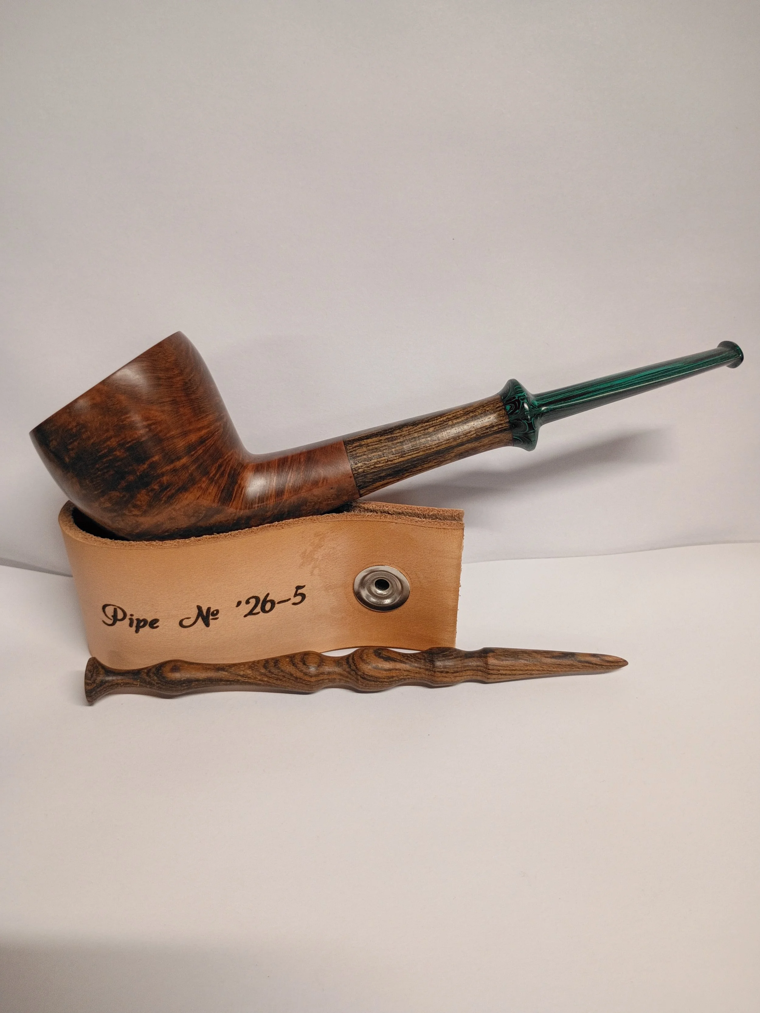 This is my 5th pipe made in 2026. It is Greek briar the went through the heat treatment process. The shank is bocote, with an ebonite stem. The tamper and stand are included in the purchase of the pipe.