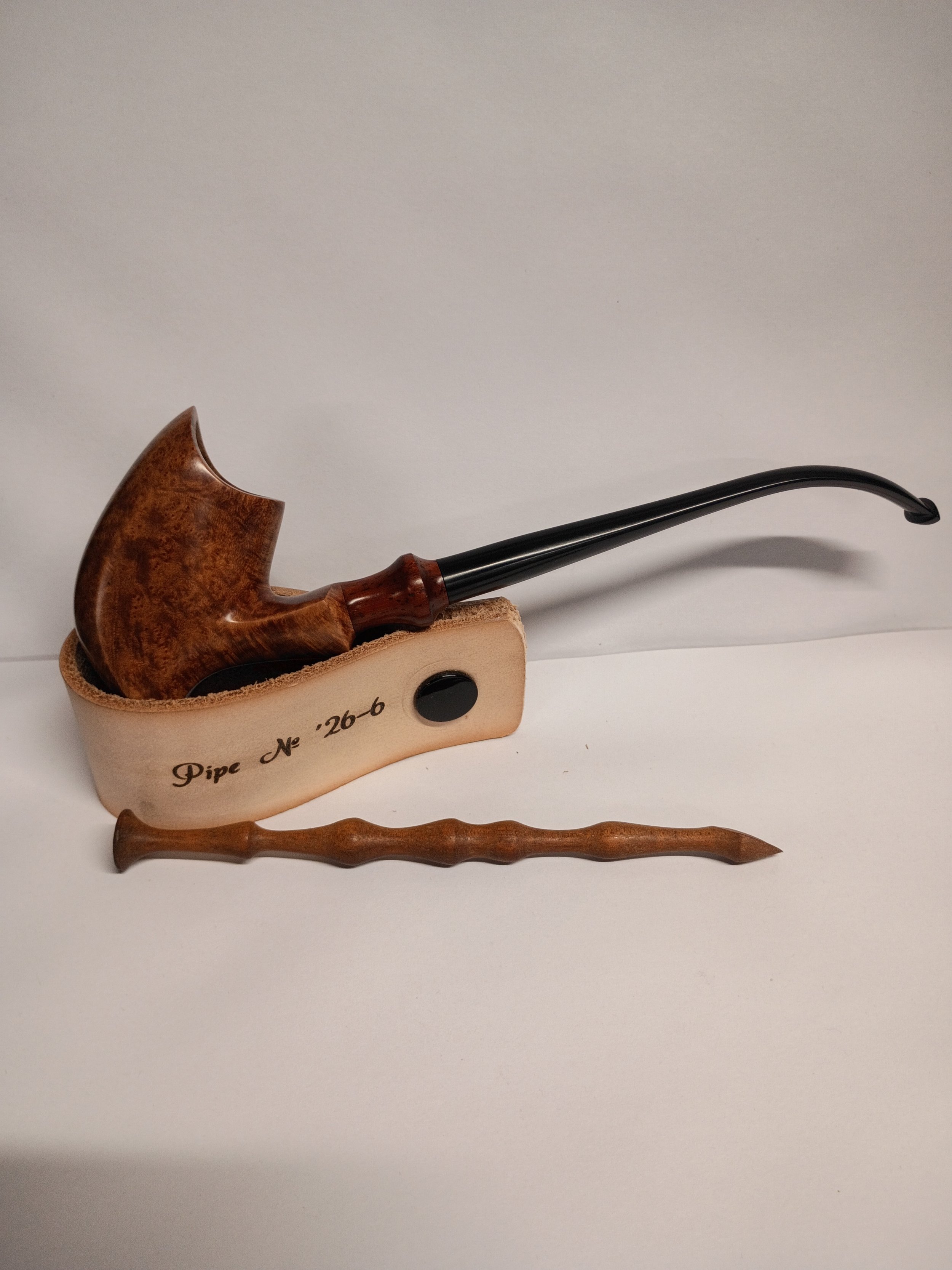 This is my 6th pipe made in 2026. It is Greek briar with cocobolo shank extension followed by a vulcanite stem. The button is 4mm. The tamper and stand are included with the purchase of the pipe.