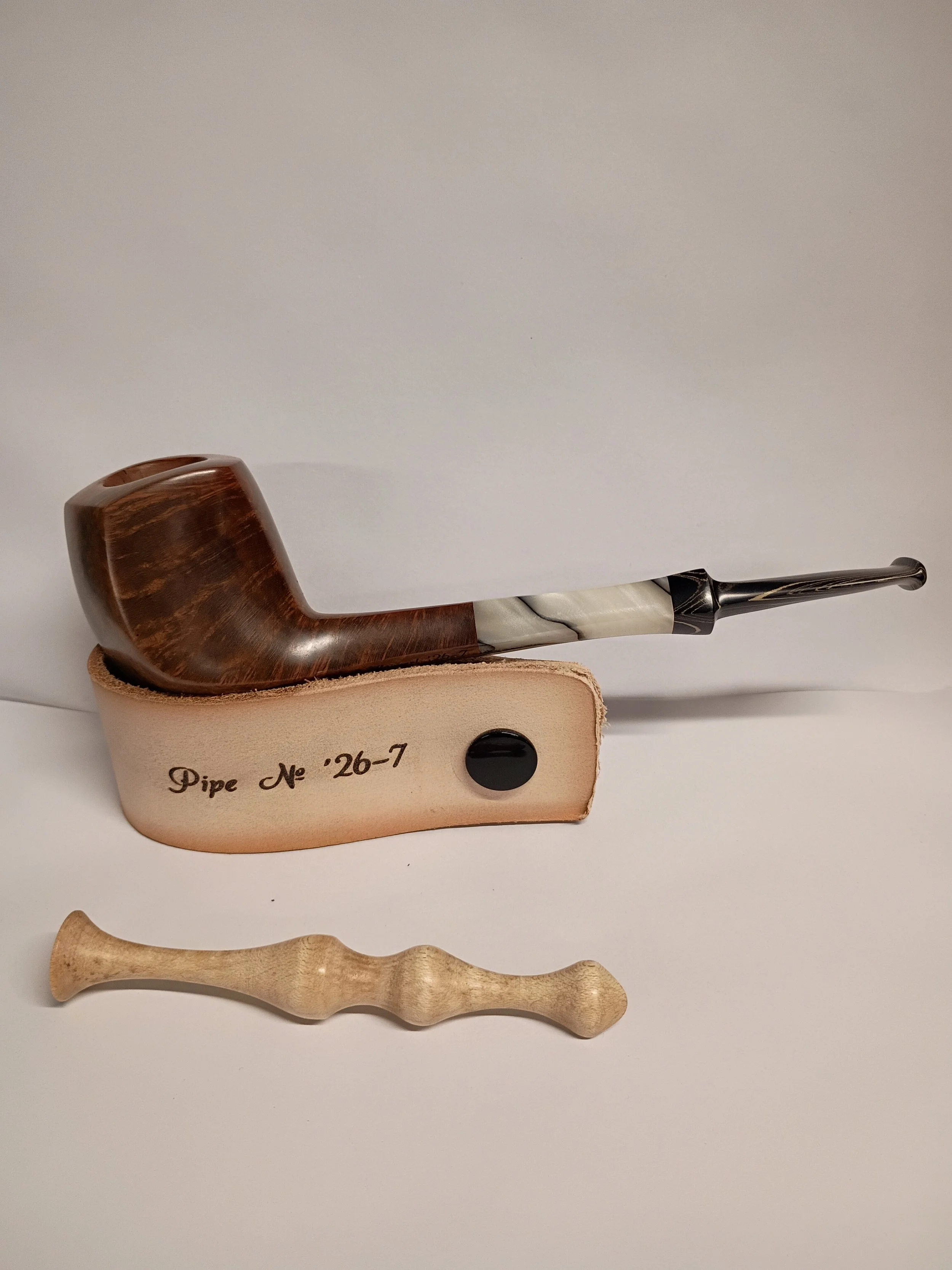 This is my 7th pipe finished in 2026. The briar is is Greek. It went through the heat treatment. A process that involves boiling the wood in a certain vegetable oil. And then heating it until the oil is completely dry. The result makes the wood feel like glass when sanded and buffed. Also there is no break in period. It smokes like a well seasoned pipe. The tamper and stand come are included with the purchase of this pipe.